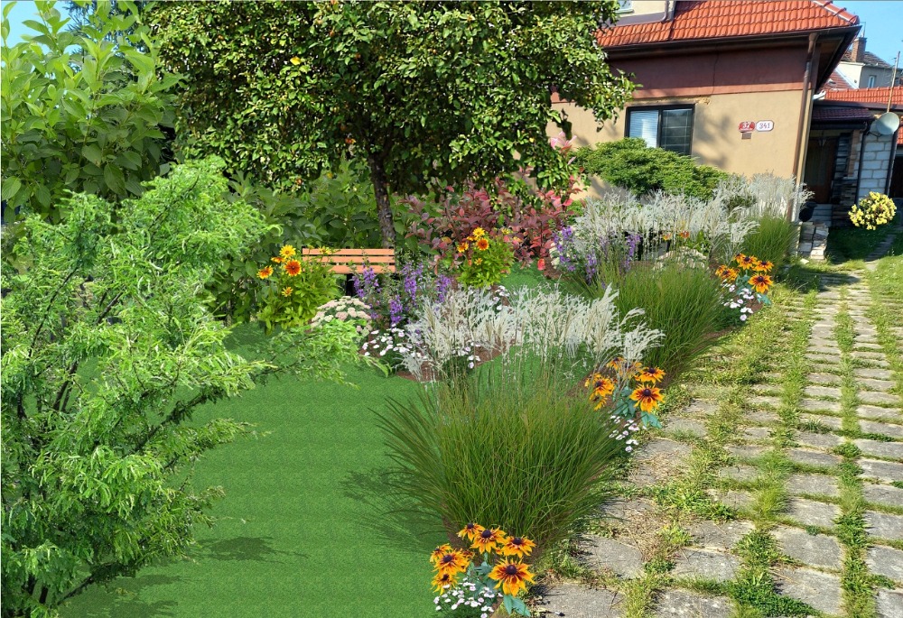 Pod stromem je umístěná lavička obklopená trávami (kavyl) a kvetoucími trvalkami. Nechybí ani vonné druhy (hvozdík, večernice) a dlouhokvetoucí rostliny (rudbekie, rozchodník, krásnoočko). Samozřejmě toto je pouze nástin toho, jak by to příp. mohlo vypadat, můžete si dosadit i jiné barevné kombinace rostlin, podle toho, co se vám líbí a k čemu tíhne vaše duše. 🙂