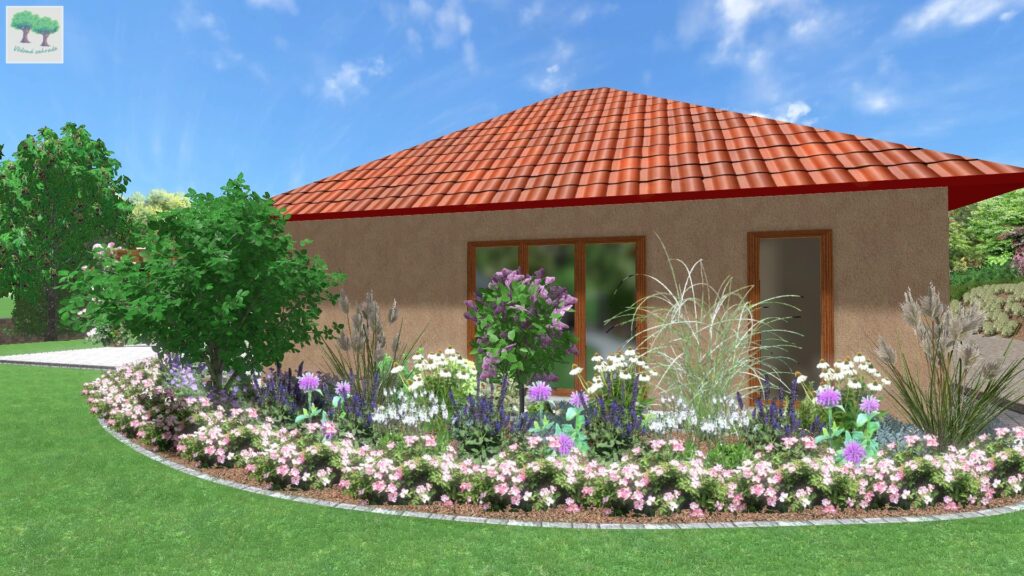 Okraj záhonu tvoří kobercové floxy, neboli plaménka šídlovitá, kterou můžete zakoupit v mnoha barevných variantách. Mezi nimi jako nízký doplněk vynikají 3 kusy řebříčku „Tutti Frutti“ světle růžové barvy, ale dají se zakoupit i jiné barevné odstíny.