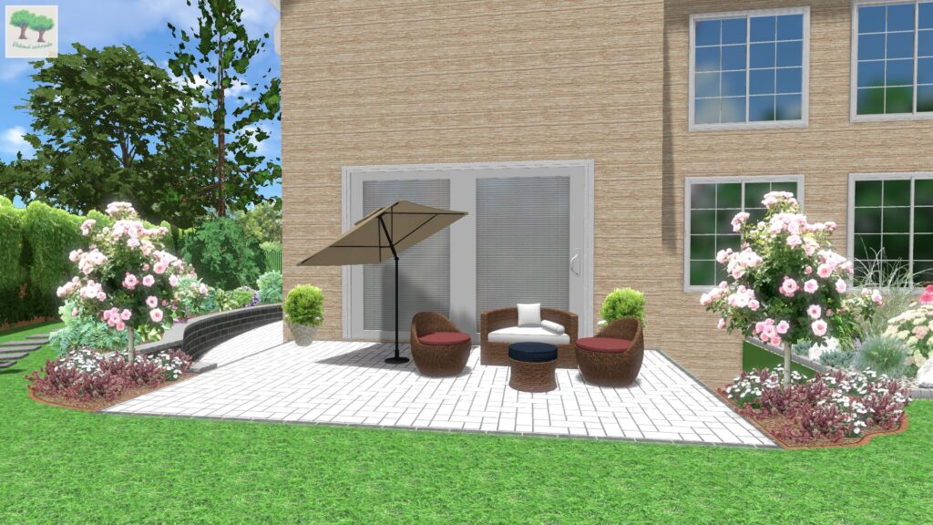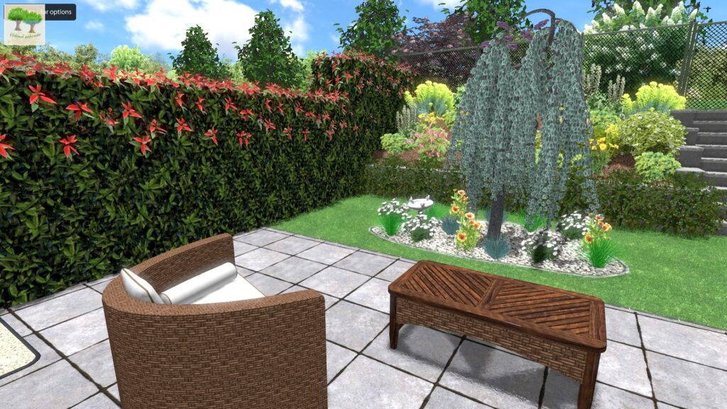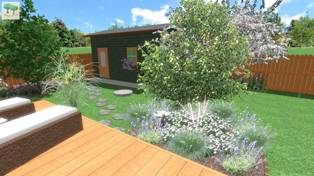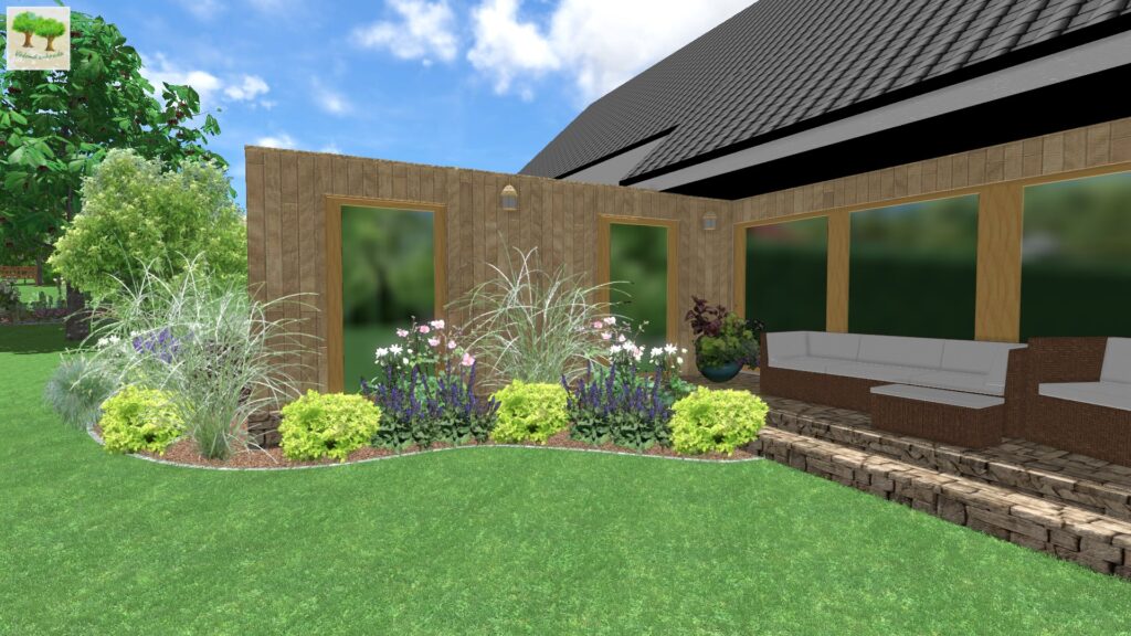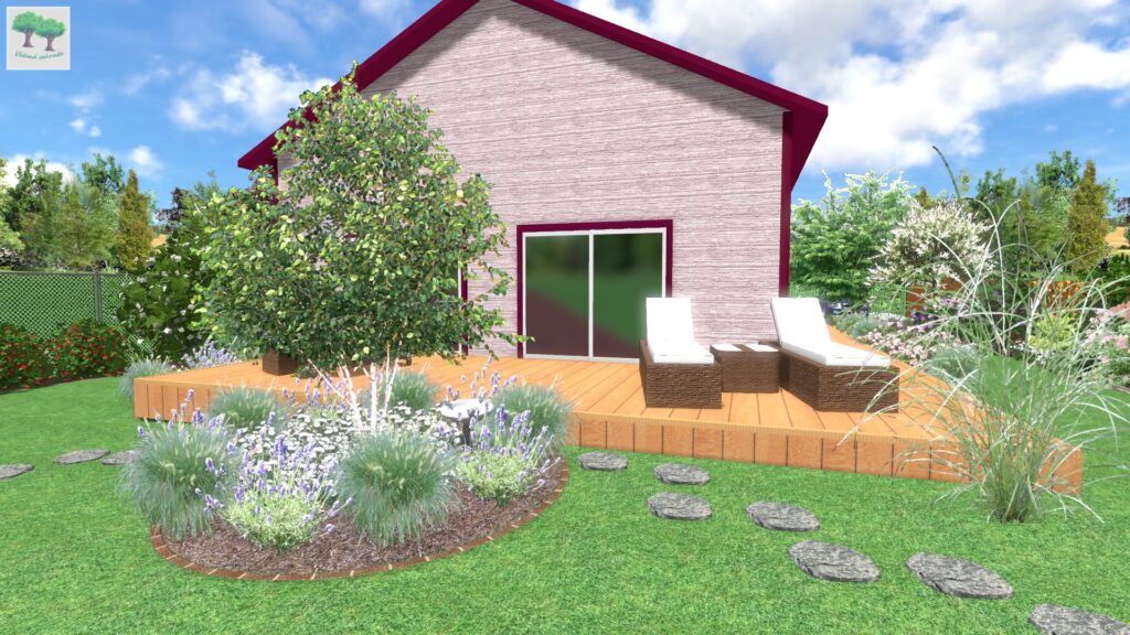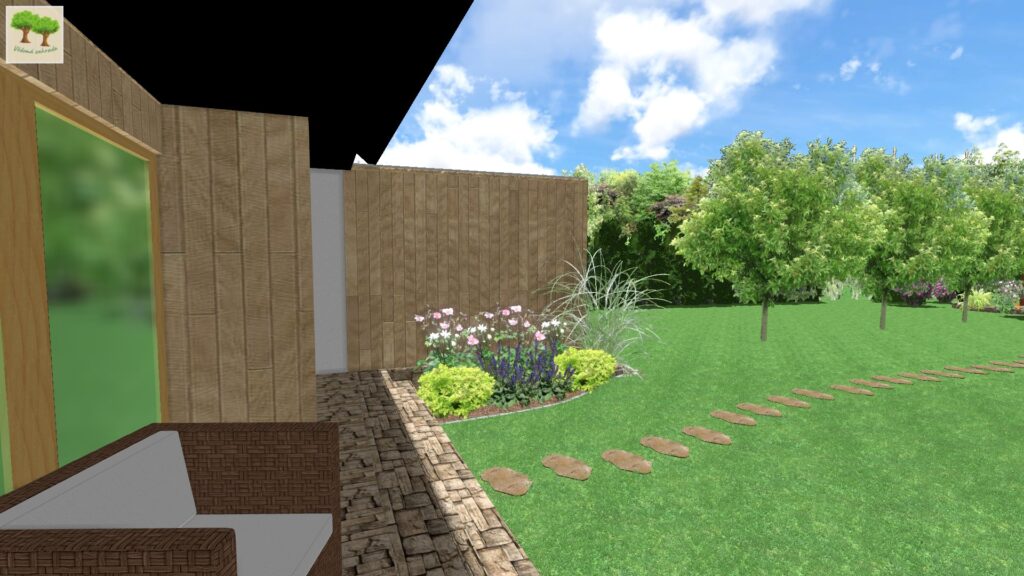 Podíváme-li se tedy na obrázek výše, vidíme zde terasu, která směřuje na JZ až západ, kde jako podrost pod břízou himalájskou tvoří kombinace levandulí s hvozdíkem pýřitým a okrasnou trávou (dochan psárkovitý). Levandule budou zdobit okolí terasy v létě, hvozdíky pokvetou v květnu a zhruba od června bude celý prostor zdobit svou lehkostí dochan, který pak koncem prázdnin utvoří nádherné klásky, jež na rostliny vydrží až do jara, dokud ji neseřízneme.
