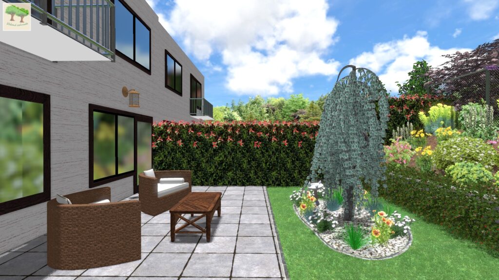 Aby u terasy zbyl volný prostor, ale zároveň zde rostlo něco, co bude stínit přilehlé místnosti, zvolila jsem jako dominantu převislou formu cedru atlantského „Pendula“. Převislou formu proto, že není tak ohromná jako běžná forma cedru a můžeme ji sami tvarovat do požadované výšky i šířky. Cedr je samozřejmě stálezelený druh.