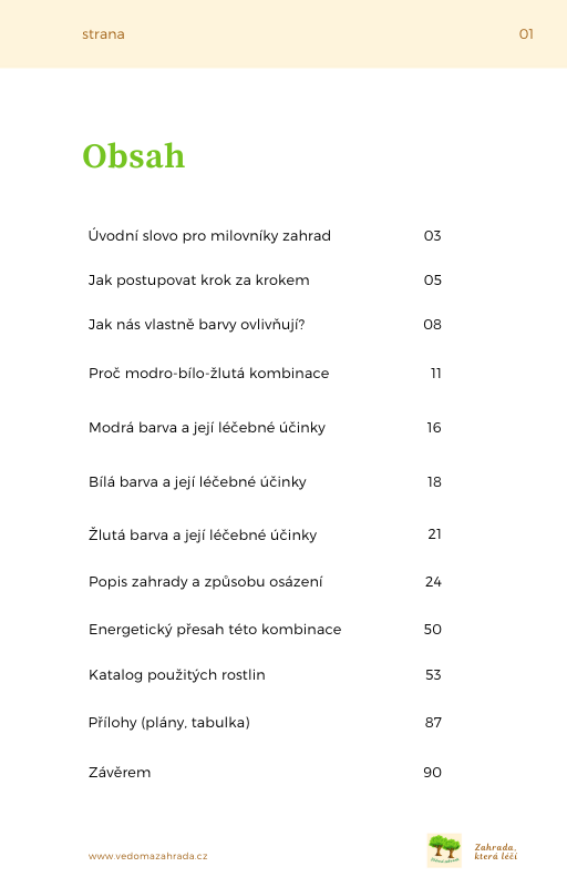 Je pro vás připraven eBook s textem, vysvětlením a popisem, jak na nás jednotlivé barvy v zahradě působí, fotografiemi, obrázky, osazovacími plány a nákupním seznamem rostlin. Nechybí ani katalog všech v návrhu použitých druhů rostlin a návod, jak se o ně starat a jakou péči vyžadují.