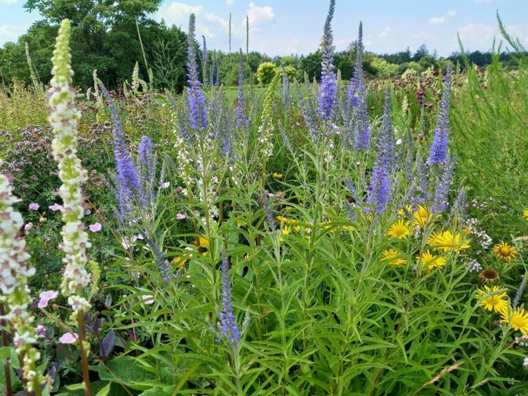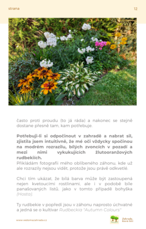 Intuitivně jsem totiž zjistila, že potřebuji-li si v zahradě odpočinout a nabrat sil, mé oči vždycky samovolně spočinou na modrém rozrazilu, bílých zvoncích v pozadí a mezi nimi vykukujících žlutooranžových rudbekiích.