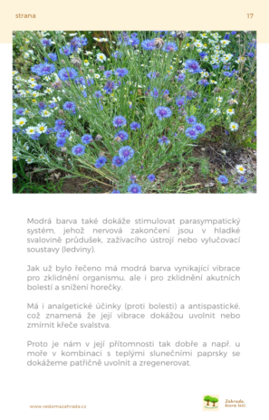 Jednotlivé barvy mají své vlastní vibrace a ovlivňují tak naše psychické rozpoložení při pobytu v zahradě. Právě tato barevná kombinace je vhodná pro osvěžení a harmonizaci vaší mysli i těla.