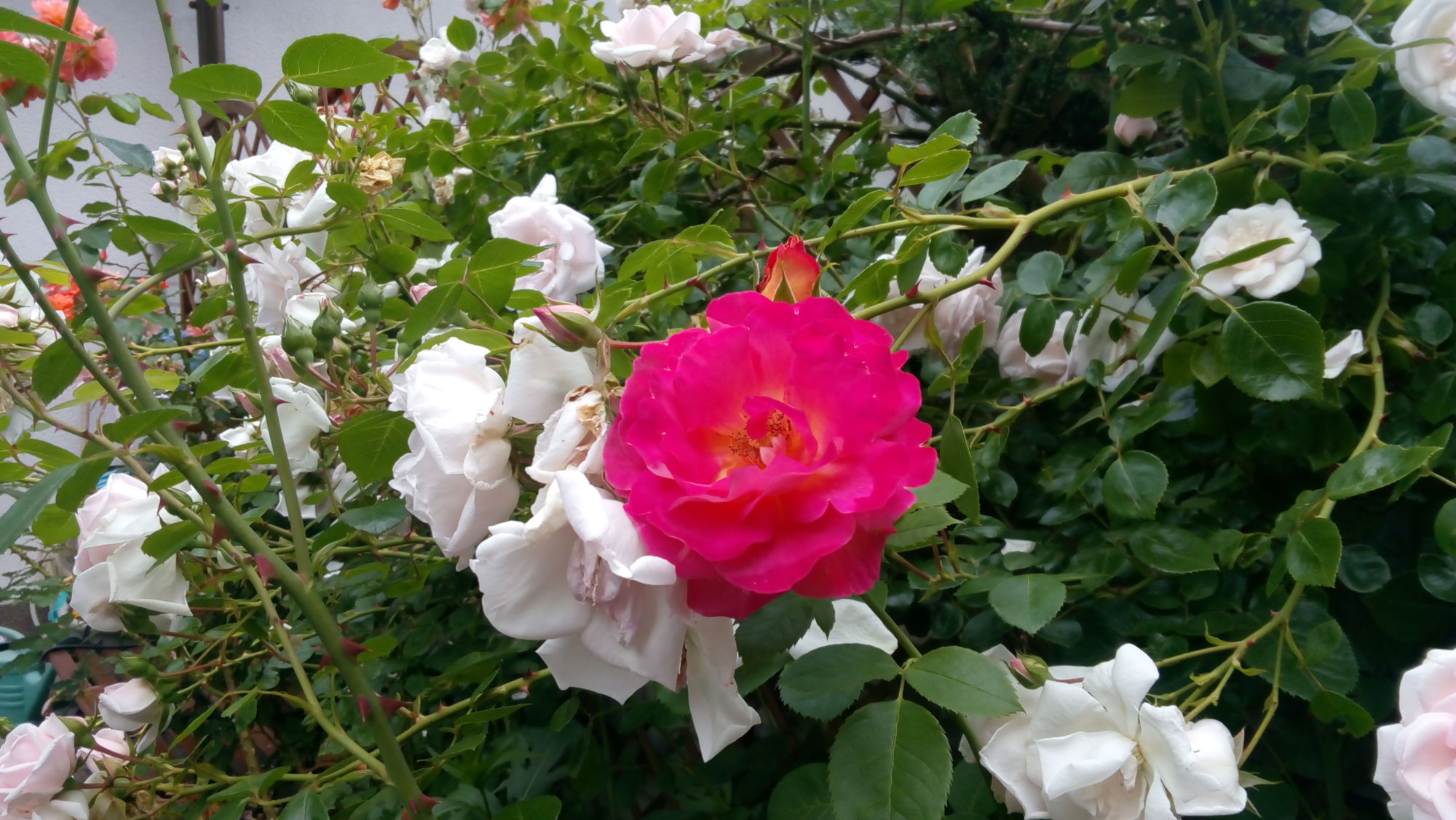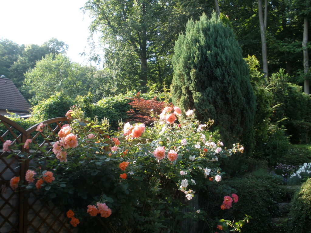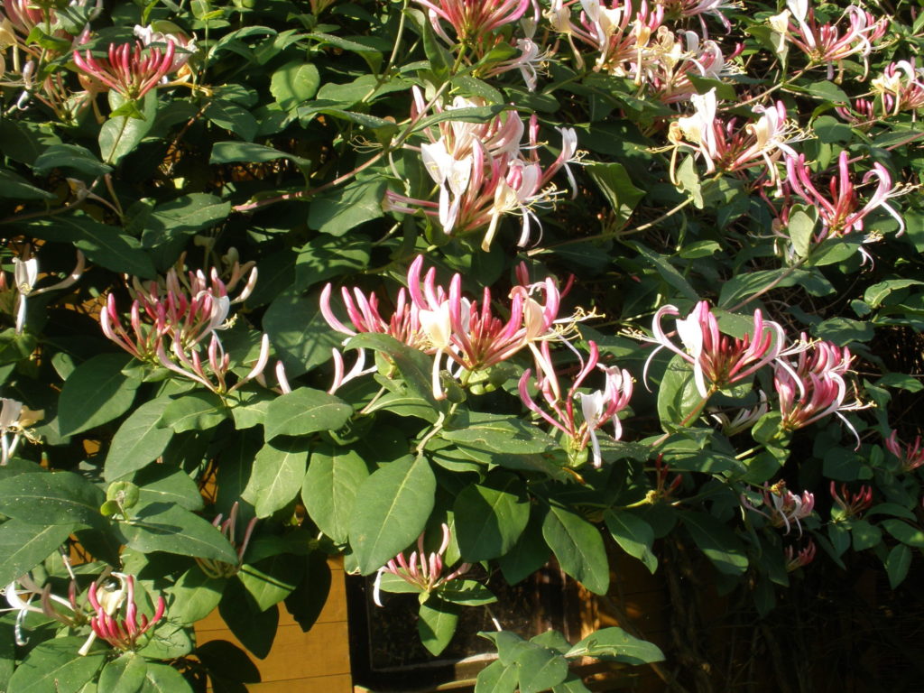 Na obrázku níže je na naší zahradě rdesno propletené se zimolezem (Lonicera), který se pne nad lavičkou a rdesno je směrem vpravo. Vidíte tu kompaktní hmotu, která si roste sama a občas ji zastřihnu pouze pro udržení chtěného tvaru.