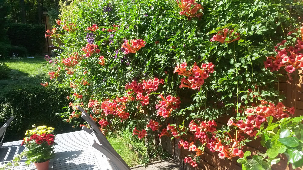 Kompaktní hmotu, i když za trochu delší čas, vám vytvoří nad pergolou i trubač (Campsis). Máme ho již dvacet let (obr. níže) a dá se pod ním sedět i za mírného deště. Návod na relaxační koutek u jezírka naleznete zde>>.