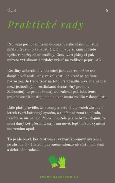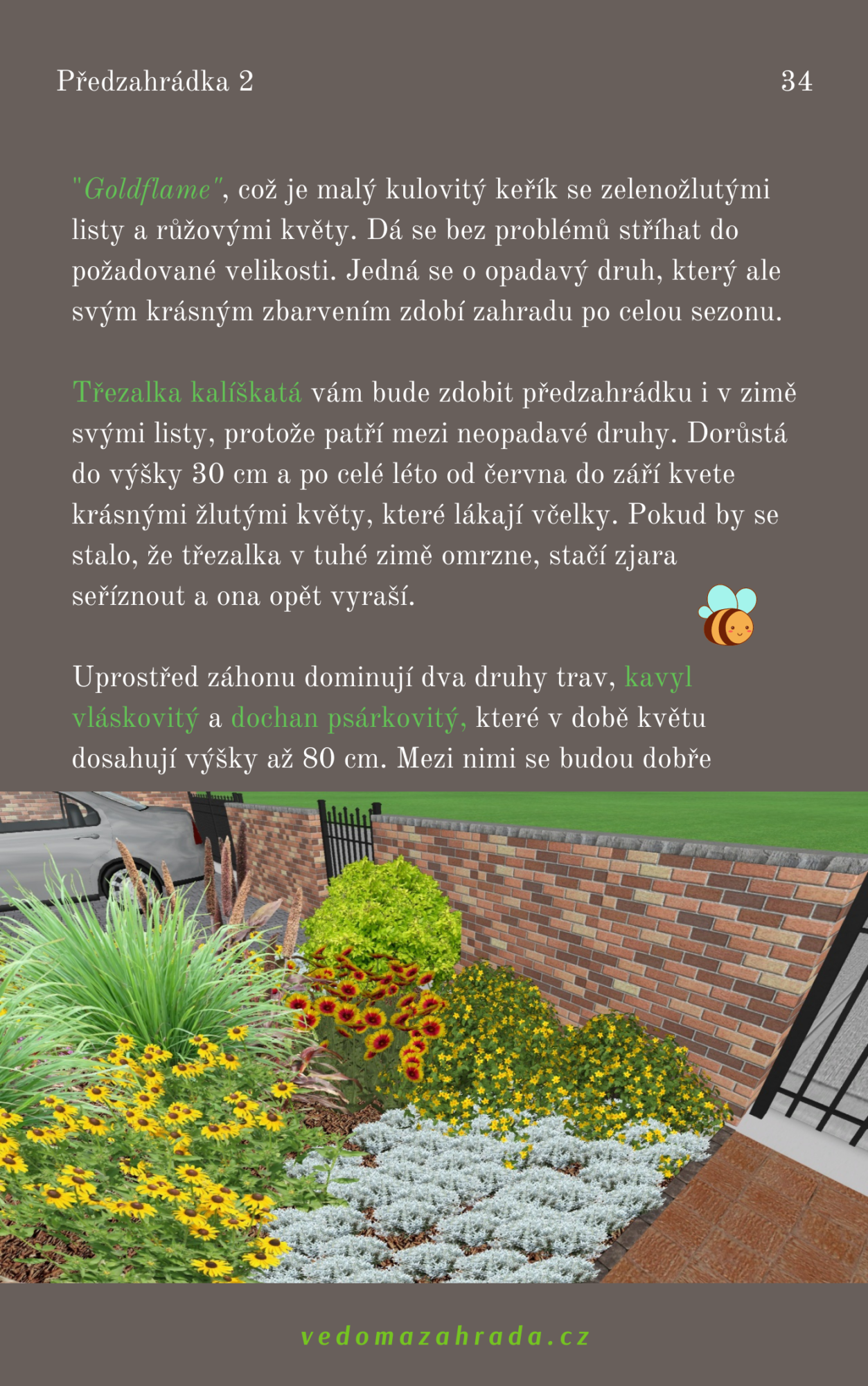 - Budete se kochat pohledem na krásnou zeleň před vaším domemV plánech jsem použila pouze takové druhy rostlin, které jsou běžně k dostání na českém trhu a které jsou nenáročné na pěstování. Nemělo by hrozit, že vám rostliny za čas uhynou.