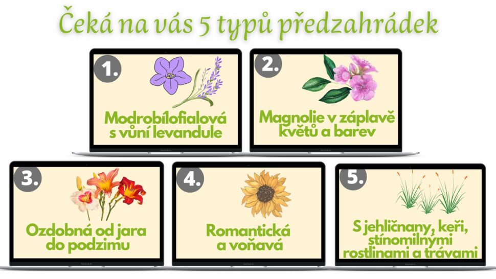 - Vytvoříte si předzahrádku v souladu s vaším cítěnímVzhledem k tomu, že součástí dokumentu je celkem 5 návrhů předzahrádek, lze si vybrat rozmístění rostlin, které vám vyhovuje a rozvrhnout podle potřeb své vlastní plochy.