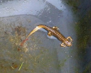 Malou úzkou zahradu je též možné odlehčit vodním prvkem. Voda vnáší do prostoru klid a může být ve formě nějaké malé přírodní tůňky nebo klidně i plastového jezírka šikovně zamaskovaného blatouchy a sítinami. Nám se do jezírka nastěhoval čolek, kterého jsme objevili na jaře při čištění. 🙂