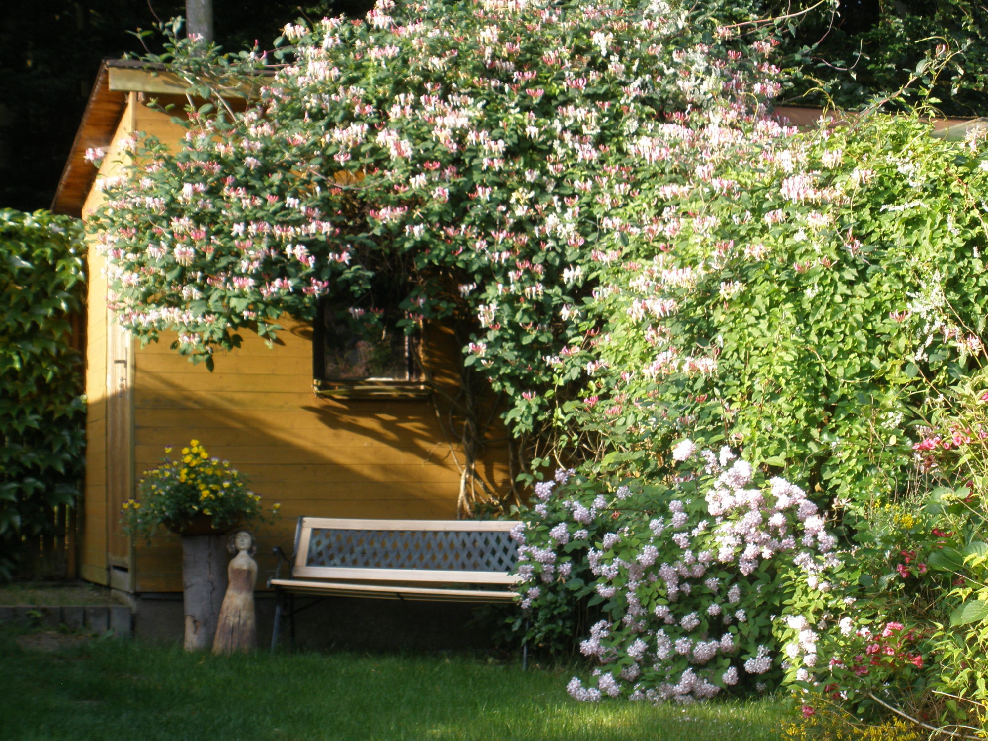 Pokud máte na pozemku zahradní domek, kůlnu, pořiďte si ji opět v přírodním stylu, tedy nejlépe dřevěnou, a ne zděnou. Anebo zděnou popněte různými druhy ovíjivých rostlin, aby stavba přirozeně splynula s daným místem a nepůsobila na úzkém prostoru rušivě. Nám se na po dřevěné kůlně pne zimolez, v létě jeho květy nádherně voní po celé zahradě a v jeho hustých větvích mají již několik let hnízdo kosi. 🙂 Pokud byste chtěli nalákat ptáky do zahrady, čtěte zde.