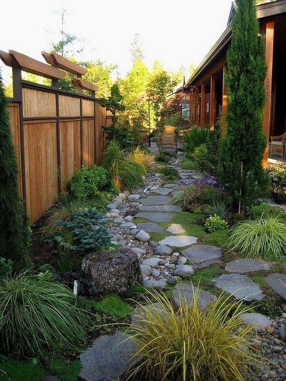 Základním pravidlem pro úzkou zahradu je nevést zahradní pěšinku centrálně, tedy uprostřed, ale vždy buď stranou nebo ještě lépe vlnitě. Zahrada se tím opticky rozšíří, a pokud k okrajům místo plotu přidáte listnaté keře nebo štíhlé stromy, bude pohled opticky zase o něco širší. Nebude totiž vidět přímo vedoucí plot, který by náš pohled udržoval v rovné a dlouhé linii.