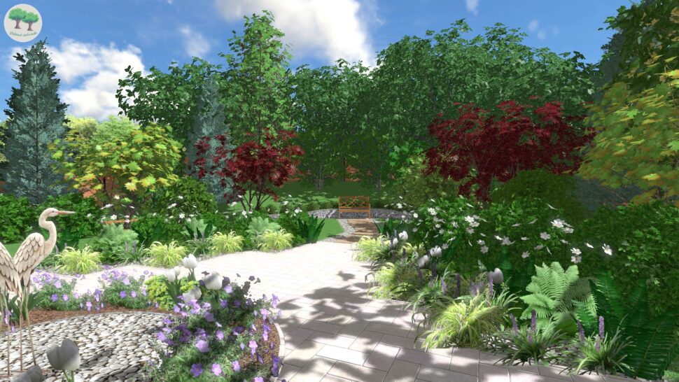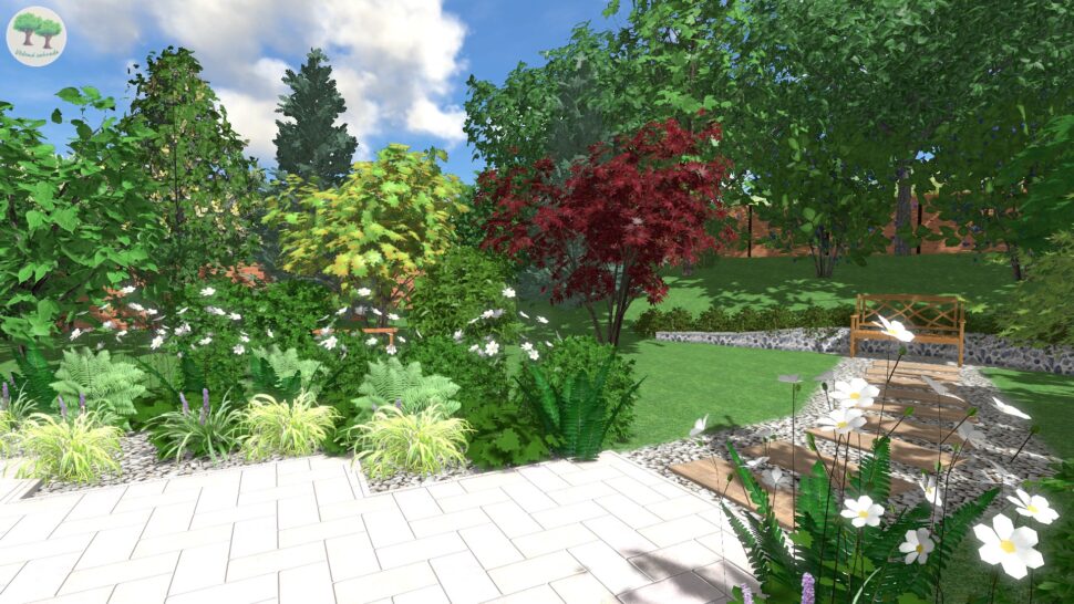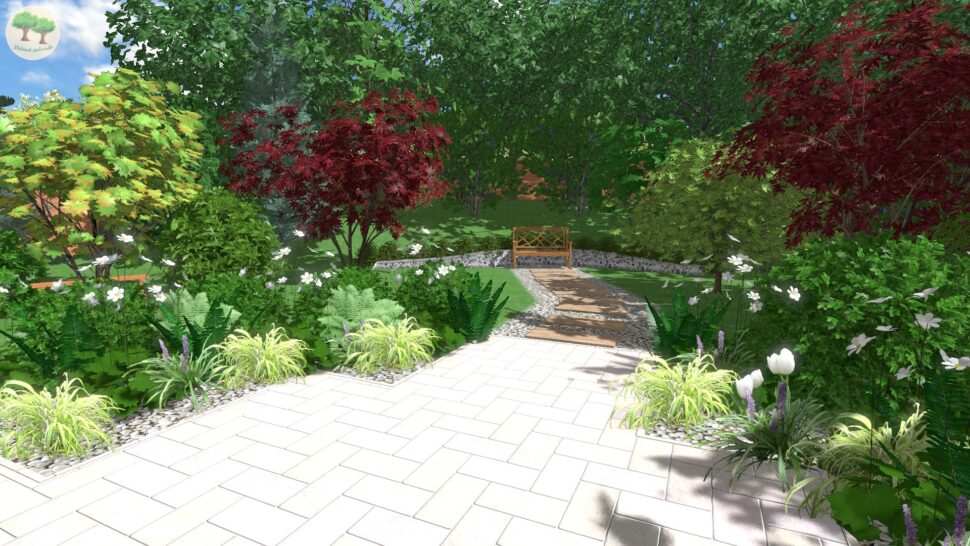 Jako kvetoucí rostliny jsem zvolila druhy bíle a modře kvetoucích trvalek a cibulovin. To proto, aby zahrada působila spíše uklidňujícím dojmem. Zelená barva by měla být dominantní ve všemi jejími odstíny. Zvláště zajímavým způsobem působí rákosovka (Hakonechloa), okrasná nekvetoucí tráva s žlutozeleným zbarvením, která dodá místům v polostínu šmrnc a náboj.