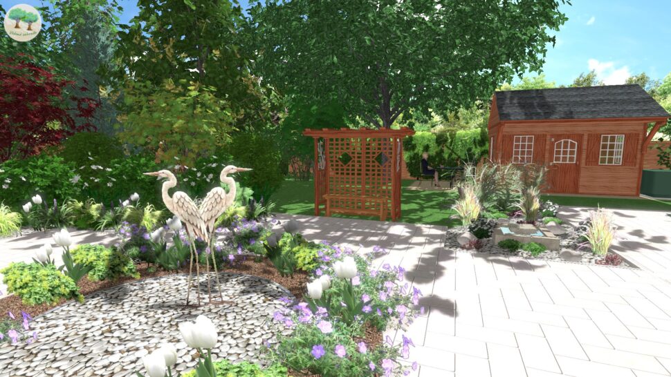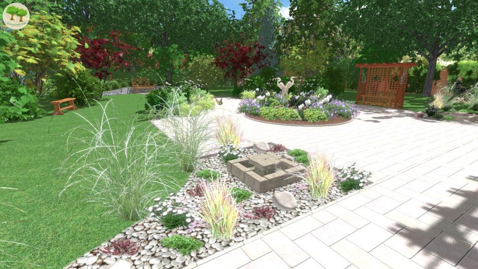 Proto jsou v návrhu přítomné hlavně různé odstíny zeleně, které mají převažovat nad barevností květů. Zelená barva napomáhá zklidnění a v kombinaci s ostatními doplňky, jako je socha volavek nebo dvě kamenné fontány, nás přivádí do přítomného okamžiku, do prostoru tady a teď. Pozorujeme jemný zvuk vody, ladné křivky volavek nebo listy okrasných trav, které se jemně pohupují při sebemenším vánku.