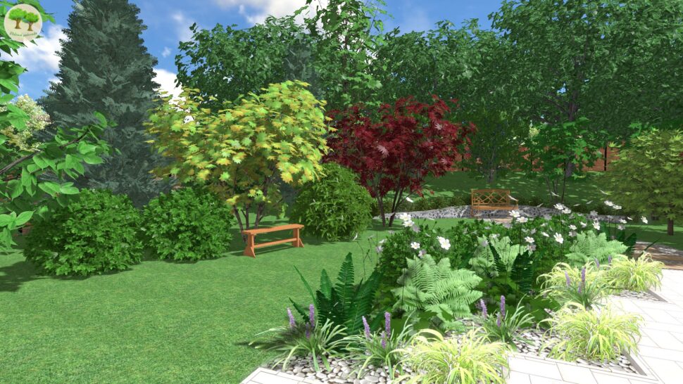 Proto by v mém pojetí měla být zahrada pro astmatiky hlavně vzdušná. Na obrázcích vidíme, že je zahrada ohraničená vysokými stromy a podrostem keřů, ale uprostřed je ponecháno volné prostranství, které prostoru zaručuje vzdušnost. Energie zde může volně proudit, ale zároveň je tu i možnost sednout si na lavičky v různých zákoutích zahrady, kde budeme moci nikým nerušeni rozjímat a relaxovat.