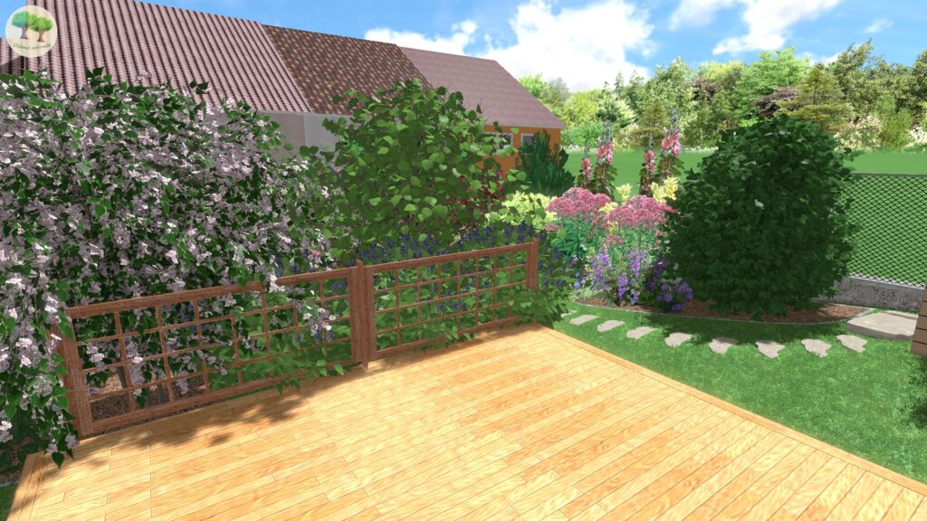 Celý koncept zahrady jsem pojala tak, aby působil vzdušně a nespoutaně. Abyste si tady dokázali odpočinout, cítili volnost, a ne pohledy sousedů z obou stran. Z toho důvodu je nalevo i napravo kolem plotu přidáno několik opadavých keřů, případně nižších stromů.